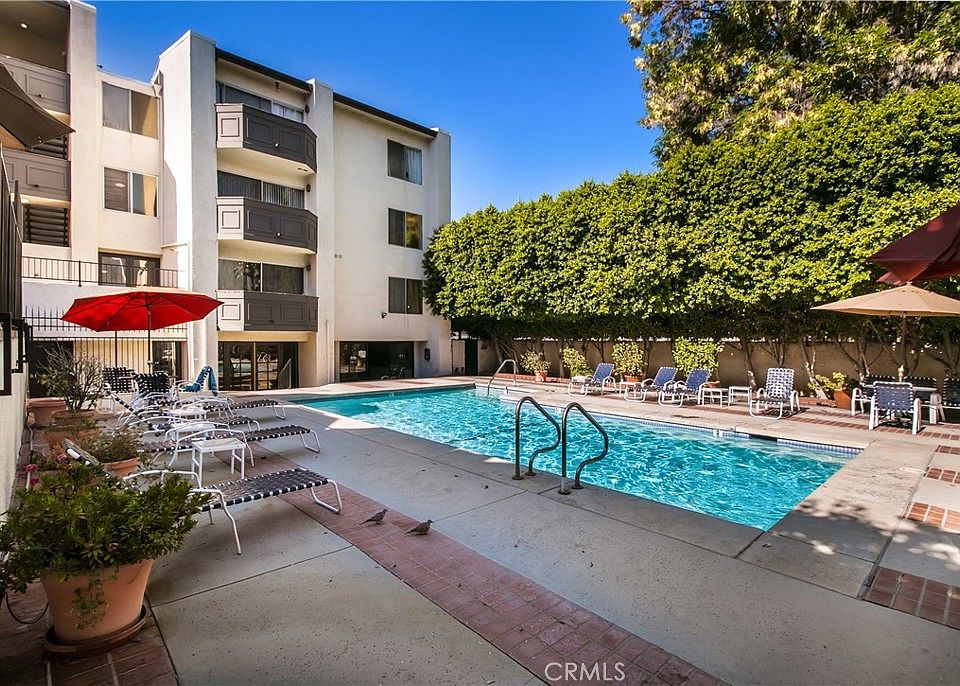 This is a must see unit. Come fall in love. This gorgeous top floor 2 bedroom, 2 bath condo will attract you with its open floor plan, extremely high ceilings and tons of natural light. The majestic double door entrance leads you in, towards an elegant crystal chandelier and a spacious living room with marble fireplace. The living room opens to a large patio with an amazing view of mountains and the city. The patio connects the living room with the primary bedroom. This well-designed condo offers everything you need; bamboo floors in the living and dining rooms, quartz counter tops in the kitchen, in unit washer and dryer, and plenty of closet space. The well-maintained complex with a heated pool and jacuzzi has a resort style atmosphere. The two car parking garage is on ground level inside the building. It is in a prime location near Ventura Blvd in Encino, close to great shopping, fabulous restaurants and night life. All of this makes this unit very attractive and desirable, and it can be yours.