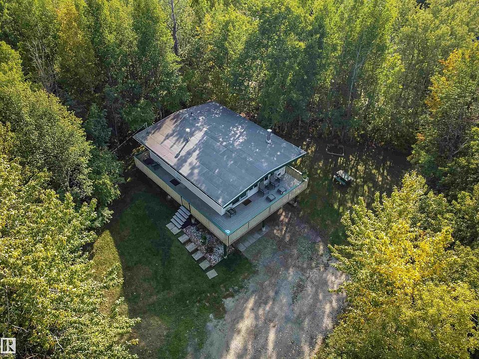 980+ sf raised bungalow set on almost a half acre in the quiet community of Sunset Point, just a block off the water and private community beach area!. The lot itself is tree lined for privacy and has a circular driveway for easy in and out. Also has a back alley access if you plan to park your RV at home. Inside has many upgrades as the home was moved in and completely updated on the main level. Big open floor plan for living room, kitchen and dining area. 3 bedrooms, and a full bath with jacuzzi tub. The lower level can be finished in living space for a additional 980 sf or converted into double garage or do both living and single garage. Wrap around deck to enjoy the wild life and birds. Breathtaking sunsets from the beach area gives this place an added appeal. Lots of opportunities for this year round country recreational style living. Only 35 minutes NW of Edmonton.