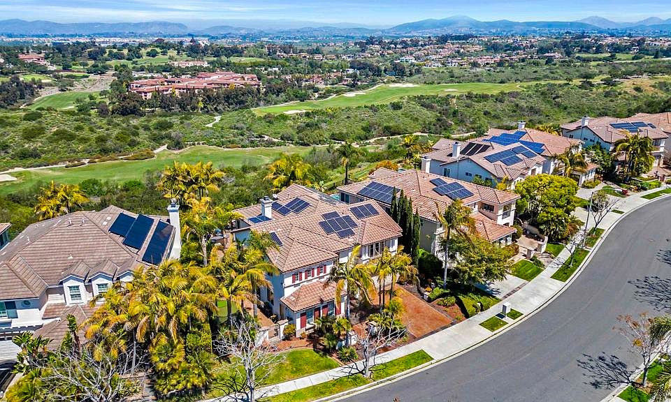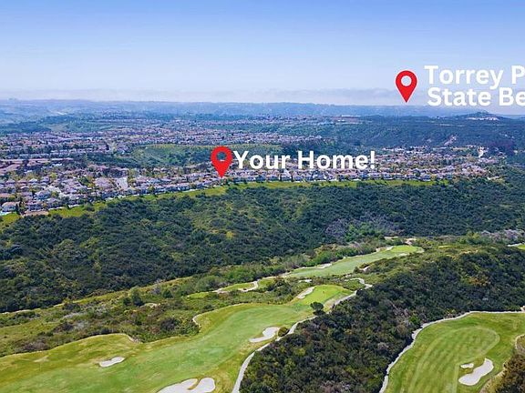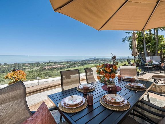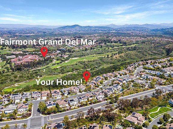 An oasis of luxury nestled in the prestigious community of Carmel Valley. This 4,226 sqft residence offers a lifestyle of unparalleled comfort and sophistication. Located on one of the most premiere VIEW homesites, this home is situated high above the Grand Del Mar. From inside the home and out, bask in the majestic views of the nearby golf course, resort and a series of mountain ranges that seem to cascade into infinity. Host an al-fresco dining party for family and friends. The built-in grill area will make entertaining easy, as the large island offers plenty of room for seating while you take in one of the most stunning backdrops in all of San Diego. Enjoy sunsets around the gas fire pit or elevated patio as you listen to your favorite tunes with the custom stereo system speakers throughout the yard. Take advantage of the extra space on your side yard to practice your short game on an artificial putting green, or work on your pickleball serve when you’re not playing at The Grand Del Mar Club. Inside the home is just as impressive as the outdoors. As you step through the grand entrance, you are greeted by soaring ceilings, a spiraling staircase and beautiful tile floors. The gourmet kitchen is a culinary delight with top-of-the-line appliances, including a Sub-Zero refrigerator, Viking cooktop and double oven. There's an abundance of rich cabinetry, a corner pantry, and a large center island for entertaining guests or enjoying casual family meals as you take in your scenic backyard. Adjacent, the open-concept living area features a cozy fireplace and expansive windows that frame picturesque views of the surrounding landscape. The main level has a formal dining room with a separate prep and serving area for all your dinner parties. There is also a downstairs guest ensuite bedroom, office/study, powder room, laundry room with utility sink, and a custom-built, temperature-controlled wine cellar complete with a hermetically-sealed door constructed of solid wood and glass. Retreat up the grand staircase to the luxurious owner’s suite, where tranquility awaits. French doors lead to your private patio deck where you'll delight in kick starting your day with a cup of coffee while taking in the views. There is also a convenient staircase leading to your backyard sanctuary. The owner’s suite offers a spa-like experience with separate dual vanities, large walk-in tile shower with dual shower heads, a soaking tub and walk-in closet. Upstairs, there are two additional ensuite bedrooms, plus a huge bonus room that offers endless possibilities to personalize, perhaps as your private home gym, movie theater, or hobby room? This home is energy efficient with a 28-panel OWNED SOLAR system, Noritz tankless water heater, salt-free water filtration system, ceiling fans throughout, retractable screens on 3 doors, and newer HVAC units. There is also a security system with interior and exterior motion detectors and a 3-car garage with plenty of storage cabinets Conveniently located in close proximity to top-rated schools, shopping, dining, and recreational amenities, this exceptional residence offers the perfect blend of luxury and convenience. Don't miss your opportunity to experience the pinnacle of San Diego living at 5442 Shannon Ridge Lane. Welcome home!