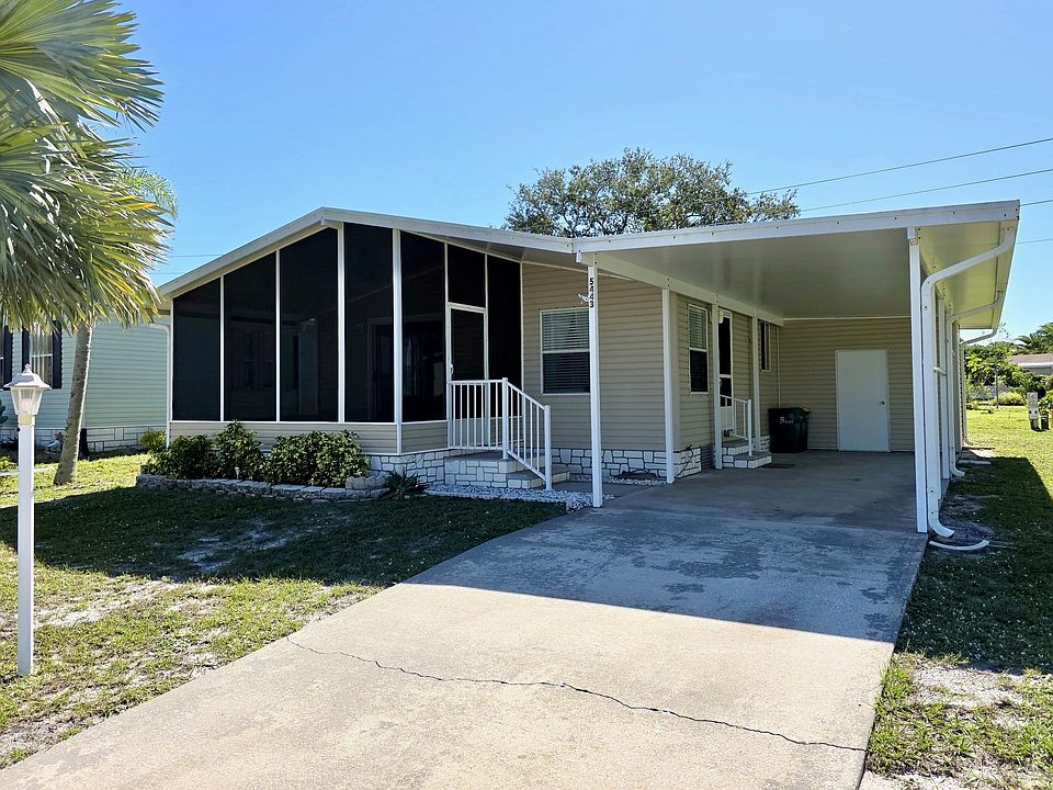 Beautiful well maintained 2-bedroom 2-bath manufactured home in immaculate condition. New roof 2024. Open floor plan with vaulted ceiling and bright natural light. Nice, screened porch off the living room, great for entertaining or morning coffee. Attached carport. There is also an attached shed for storage or workshop. Includes washer and dryer. Lots of activities and entertainment at the Snug Harbor Lakes community pool & clubhouse. Storage available for RVs and boats. Fitness room, library, card room and billiards. Located in a nice section of Snug Harbor Lakes. Shopping and restaurants nearby and a short drive to Barefoot Bay Golf Course and cafe. Affordable Florida living in a resort style community. First month's rent, last month's rent, and security deposit required.