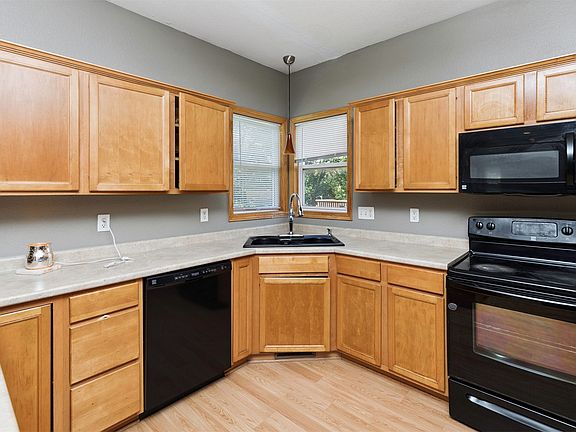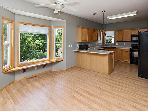 This spacious and well-maintained home offers 4 bedrooms and multiple living spaces in a highly convenient southeast neighborhood. The main level features a beautifully designed kitchen with all appliances included, a casual dining area, and a formal dining room with sliding doors that lead to a large deck—complete with steps down to the backyard, perfect for entertaining. The inviting living room showcases stunning stonework around the fireplace, with a designated space for your TV above. Upstairs, the generously sized primary suite includes a walk-in closet and a private 3/4 bath. Three additional bedrooms, a full bathroom, and a convenient second-floor laundry complete the upper level. The finished walkout basement offers approximately 600 sq. ft. (per seller) of versatile living space, including a half bath and a rec room or workout area. Step outside to enjoy expanded outdoor living with an oversized concrete patio and a private, tree-lined backyard—ideal for relaxing or hosting gatherings. Recent updates include a new roof (2022) and new siding (2023). Located in a family-friendly neighborhood, this home combines comfort, style, and functionality—making it a must-see!
