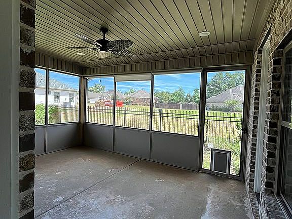 Sun filtering shadesProfessional landscapingPlantation shuttersFenced backyardScreened-in patioIrrigation systemGutters and decorative downspouts