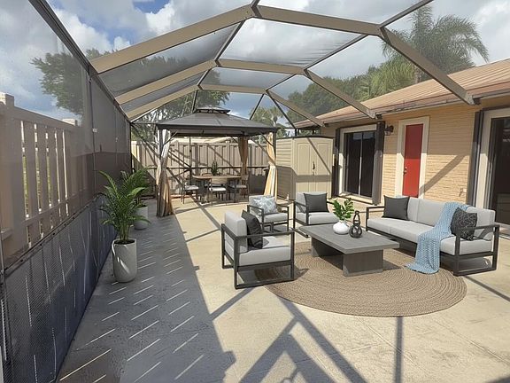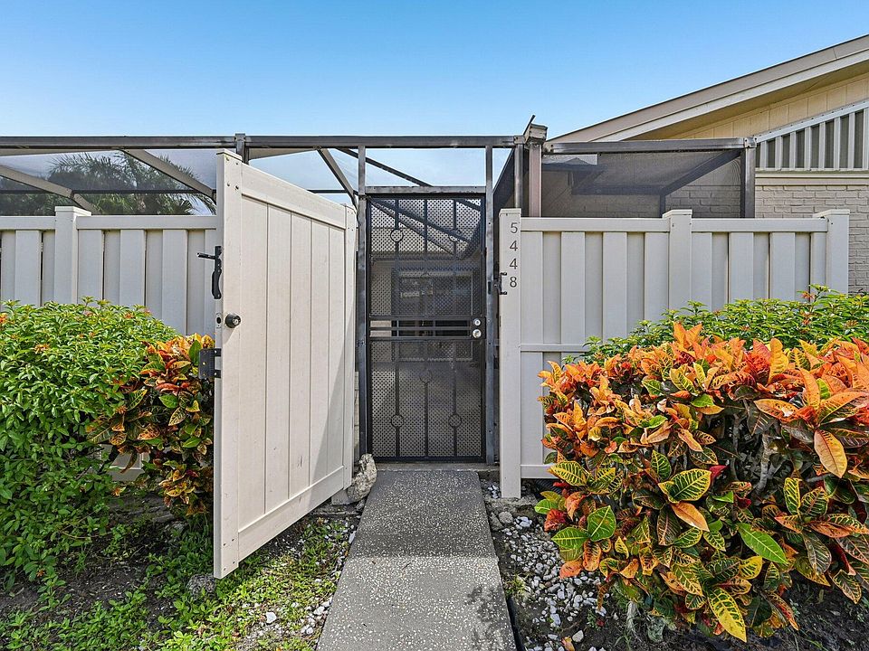 Welcome home to this beautiful 3BR, 2Bth villa, a true gem in the desirable, amenity rich community of Westwood Gardens.This home combines updated interior features with exceptional private outdoor living. Step inside an open floor plan bathed in natural light, featuring vaulted ceilings and durable plank flooring. The spacious, private courtyard is a perfect extension of your home, featuring a gazebo, outdoor electric, storage shed, nicely landscaped border all screened enclosed for outdoor comfort.Enjoy ultimate peace of mind knowing the major expenses are covered: updated kitchen, metal roof 2015 and Ruud A/C 2015. Polybutylene piping replaced 2025! Full hurricane protection on every window. Newer appliances.Come discover easy, peace of mind living, in Westwood Gardens