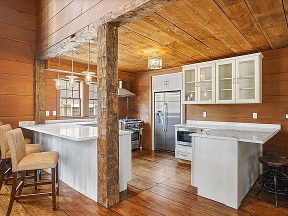 Nothing like this on the market! This is the one you have been waiting for! Walk in to this truly magnificent great room, with "King's Pine" encompassing the 20 ft ceiling, walls and floors. Oversized 10 foot brick fireplace. Custom kitchen with stunning Calcutta quartz counters, high end stainless steel appliances including Wolfe stove for the chef. This unique property lends itself to gracious entertaining and comfortable living year round. A bedroom/den with en-suite bath complete the first floor. Upstairs features the master bedroom and exquisite master bath with marble and custom tiles, and second bedroom with bath and original fireplace. Impeccable details throughout this spectacular home: designer lighting, custom millwork, upgraded electrical and plumbing. Expansive lower level fabulous for an in-law or au pair suite, ten foot high ceilings. Estate property converted to townhouse. This is an exceptional price and exceptional opportunity to become part of this home's history.