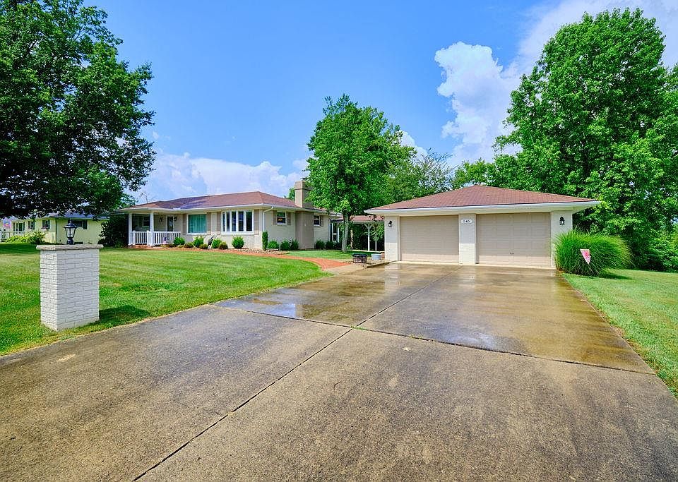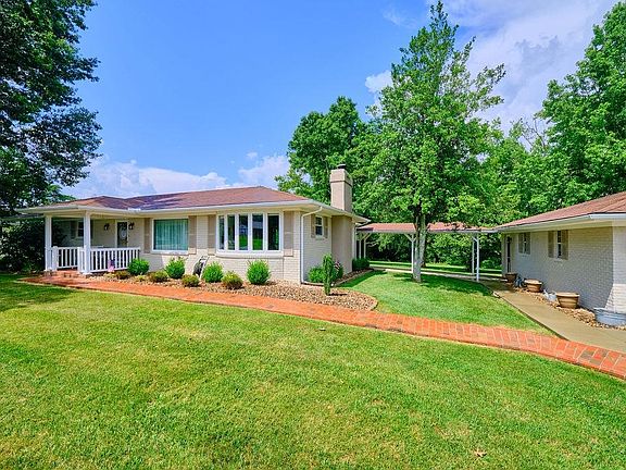 This lovely home is a rare find. Home has had immaculate upkeep. Located very near town area. Home features a living room with a foyer area, nice kitchen with bar and all appliances are included washer and dryer also in laundry room. 2 bedrooms with a large primary bedroom having a 1/2 bath. Full bath located next to 2nd bedroom. Family room used also for dining area. Has a brick firepace with area for you can add gas logs. Patio room with heat and air very nice. Also includes deck with new covered roof area beside the patio room. This home has lots of nice features. All new luxury laminate added throughout except bedrooms have carpet. Large 2 car finished garage with a home office that has a beautiful, covered walkway to. 2 storage buildings with one being new with electric 10x20. New paint throughout in 2021.