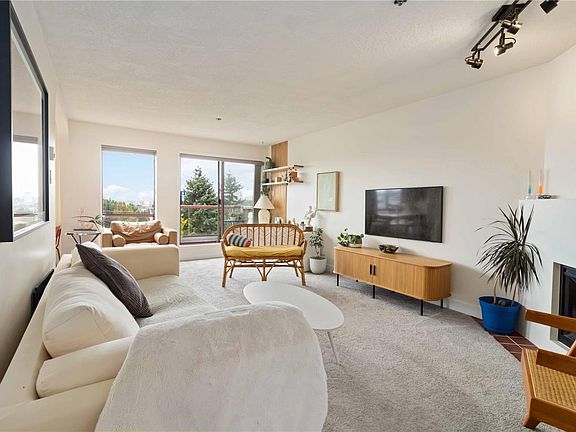 Welcome to this bright, top-floor, south-facing condo with beautiful views of downtown Victoria and the Olympic Mountains. Bathed in natural light, this nearly 1,000 sq ft 2 bed/2 bath home blends comfort and lifestyle. Start your mornings with sunshine and coffee on the balcony, and end your day by the cozy new fireplace. The spacious layout features expansive windows, a generous primary suite with walk-through closet and ensuite, plus recent updates: kitchen and bath flooring, fresh paint, lighting, hot water tank, washer/dryer, and more. Enjoy the convenience of in-suite laundry, secure underground parking, and a storage locker in a professionally managed, pet-friendly building. Nestled on a quiet residential street near the Selkirk Waterfront, Downtown, Mayfair Mall, parks, and transit. With stunning views, thoughtful updates, and a location that can’t be beat, this condo strikes the perfect balance of style and comfort. It just feels like home the moment you walk in.