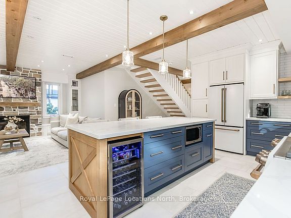 DREAM HOME - Welcome to this stunning, custom-built 3-bed, 3-bath home showcasing exceptional craftsmanship, built in 2023, perfectly positioned backing onto protected land & directly across from the river in beautiful Wasaga Beach. Designed w/ a mix of modern luxury & timeless character, this home captures a century-home feel with its large mouldings, custom doors, & wood beams with a custom-built stone fireplace accenting the main floor. Inside, the bright open-concept layout features wall-to-wall windows overlooking the forest, flooding the space w/ natural light. The custom kitchen is a true showpiece, showcasing a large quartz island, blue and white cabinetry, a mini wine fridge, & a full quartz backsplash. It's finished w/ a high-end signature line of Wi-Fi-enabled appliances, combining elegance & smart convenience for the modern homeowner. The dining area sits beside large windows, while the living room offers aged wood ceiling beams and tongue-and-groove ceilings that bring warmth & texture throughout along w/ the wide-plank white oak hardwood. Upstairs the hardwood stairs, lead to spacious bedrooms, each w/ custom walk-in closets, built-in desks, shiplap ceilings, & designer touches like wallpaper accents & skylights. The primary suite feels like a retreat, featuring a cozy fireplace, luxurious ensuite w/ floating tub, double quartz sinks, black cabinetry, & a walk-in closet w/ custom cabinetry & make up desk perfect for getting ready for the day.Luxury features include- Inside entry to garage with epoxy flooring + custom storage, hydronic in-floor heating, heated driveway & walkways while outdoors, enjoy the built-in BBQ, rubberized surfacing on patios w/ hot tub hook up, sprinkler system, & tranquil forest backdrop w/ cedar trees surround the patio for privacy.Interior features include motorized blinds, smart home system, security cameras, spray-foam insulation, high-efficiency boiler system, & a hard-wired generator. One to remember!