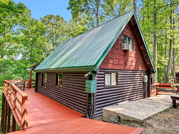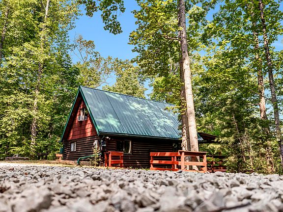 Perfect time to own a log sided cabin close to the water at Cave Run Lake and water access at the Leatherwood boat ramp is a short drive from this cabin. This log siding A Frame Is located close to the Daniel Boone National Forest with a wooded view off the back and a short walk to the waters of Cave run Lake. This cabin is a 3 bedroom, 1 bath, with window air and baseboard heat. Solid pine hardwood flooring on the first floor with an open living/dining area and small kitchen, there is a bathroom with shower and tile flooring and 1 primary bedroom downstairs with a closet. There is a spiral staircase in the living area which leads to two more bedrooms upstairs. There is a large covered back deck and wrap around decking on three sides of this cabin. Cabin being sold fully furnished. This cabin is total electric, has a cistern for water, and a septic system. Enjoy the peace and quiet with wooded views at Leatherwood.