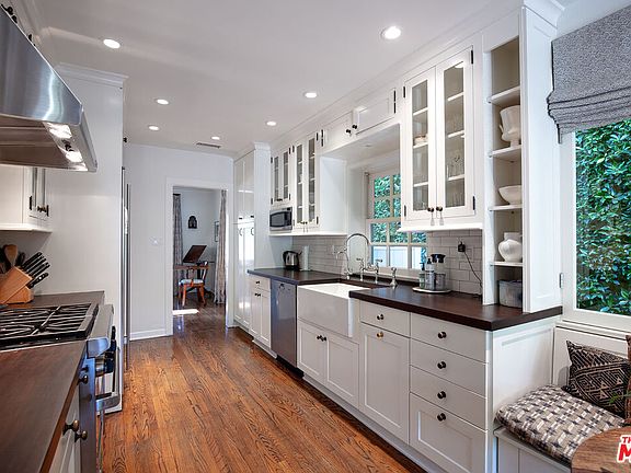 Very special, classic two-story Traditional gem on quiet street in very close proximity to both the ocean view bluffs and Palisades Village. Great street presence, timeless architecture, lovely gardens, wonderful charm inside and out and the very best lifestyle! A welcoming covered brick front porch leads to a warm, inviting and well-detailed formal living room with fireplace and formal dining room with French doors. Remodeled cook's kitchen with breakfast area and adjacent family room opens through French doors to lush, very private garden surrounded by tall hedges. Three bedrooms, two baths plus a separate office with built-in desk and bookshelves. Primary suite is a sun-filled retreat with wrap-around windows, a large, covered porch that overlooks the garden, two generous closets and remodeled bath. A detached bonus/guest room with vaulted ceiling, French doors, bath and partial kitchen set in the garden provides additional flexible space. Hardwood floors, crown mouldings, extensive built-in cabinetry, and lovely Traditional detailing can be found at every turn. A quintessential New England Traditional home close to the ocean and town with great authenticity and charm in the very best neighborhood.