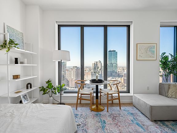 The building's amenities include a bright fitness center, game room, golf simulator, coworking lounge, conference rooms, rooftop sun deck, and a private outdoor pool located on the fifth floor. The building also offers bike storage, and private storage cages for rent with a door person present seven days a week from 11AM to 7PM.