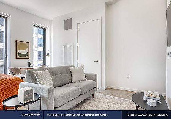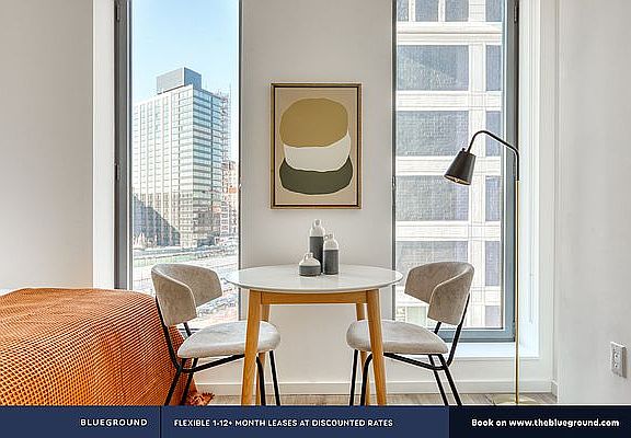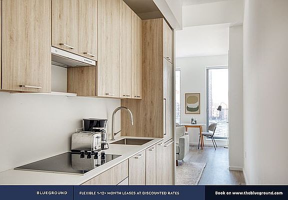 We offer custom pricing for any duration. Rates may vary upon exact move in and move out dates. The rate for this home starts at $4,120* / mo. Please visit our website and enter your dates of stay to see up-to-date pricing for your specific booking. *Price quoted is: (1) based on moving in the first day the unit becomes available, (2) applicable only if billed upfront; can be higher if billed in multiple payments, (3) exclusive of any taxes or utilities. Brokers are welcome! We pay 5% commission on the rent. Show up and start living from day one in Brooklyn with this sophisticated studio Blueground apartment. You'll love coming home to this thoughtfully furnished, beautifully designed, and fully-equipped Clinton Hill home with stunning views over the city. (ID #NYC1022) Designed with you in mind As with any Blueground apartment, you'll find a thoughtfully designed space complete with beautiful furniture and a fully-equipped kitchen in this studio property. And, thanks to our superior quality mattresses, luxury linens, and towels, you can relax knowing you'll always feel comfortably at home. When you're ready for some fun, you can take in the Brooklyn vibes or bring the entertainment to you with the premium wireless speaker or smart TV. This apartment also offers in-apartment laundry. *Sleeping Arrangements* - Queen Bed, 63in/160cm *Amenities* Building amenities unique to this studio include an on-site: - Doorman - Dryer - Elevator - Gym - Swimming pool - Washing machine - Lounge - Pets allowed *Arrival and ongoing support* The entire apartment is yours to enjoy! You'll either be personally greeted by a Blueground team member or given self check-in instructions. Throughout your stay, you'll have access to our Client Experience team through the Blueground App. You can schedule additional cleanings, submit maintenance requests, and view our neighborhood recommendations with just a few taps. We'll share all details upon confirmation of your stay. *Ideally Located* This furnished apartment is located in Clinton Hill, a historic downtown Brooklyn neighborhood. The area is home to trendy shops, inventive restaurants, and plenty of beautiful brownstone buildings. The Pratt Institute, a prestigious art college, is located in Clinton Hill. Other nearby attractions include lovely Fort Greene Park and Barclays Center, a massive sports arena and concert venue. Clinton Hill is served by the A, C, and G lines of the New York City subway system. *Other things to note* Building amenities may have an extra cost. This Blueground apartment has flexible lease options, allowing you to book it for one month, a year, or more. This Blueground apartment has flexible lease options, allowing you to book it for #one month#, a year, or more. Pets are welcome, though weight limits and breed restrictions apply and may incur fees. Brokers CYOF. We take great pride in ensuring every photo displayed is shot in our own apartments with our actual furnishings. That said, we regularly refresh our decor and furniture arrangement, which may differ from whats pictured.