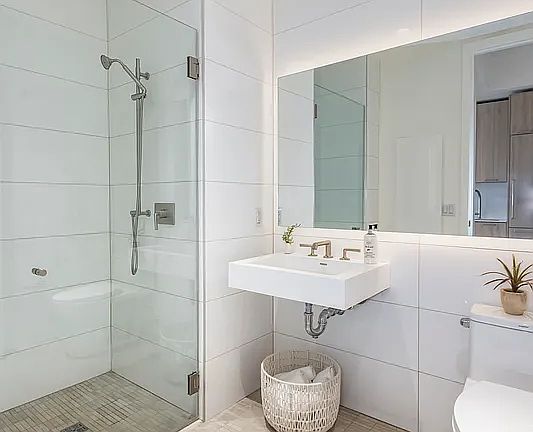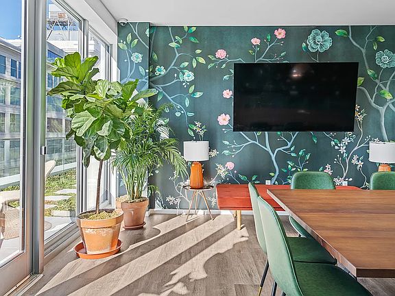 The building's amenities include a bright fitness center, game room, golf simulator, coworking lounge, conference rooms, rooftop sun deck, and a private outdoor pool located on the fifth floor. The building also offers bike storage, and private storage cages for rent with a door person present seven days a week from 11AM to 7PM.
