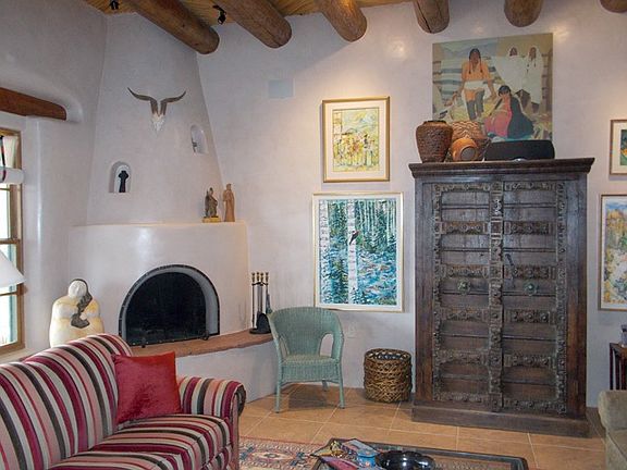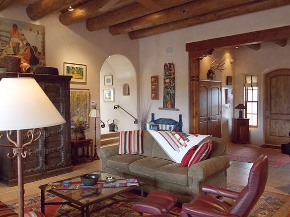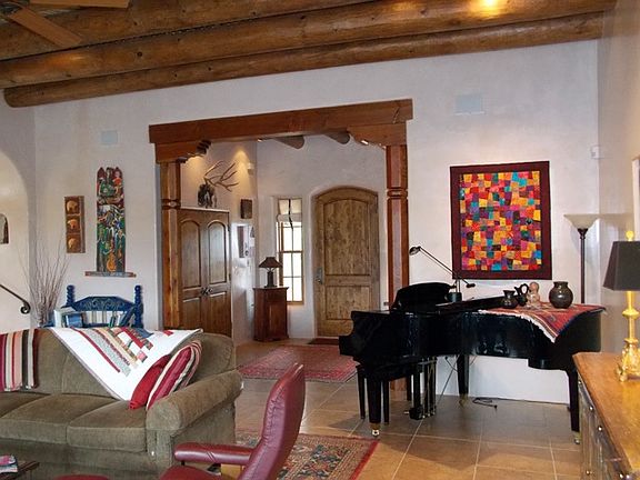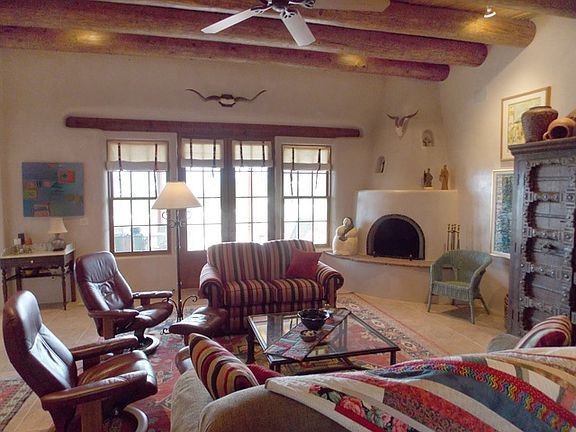 Architectural Digest, eat your heart out! This beautifully designed, thoughtfully constructed Pueblo Revival home nestled against U.S. Forest Service land in the Weimer foothills is a timeless work of art. A flagstone walk leads through a welcoming garden to a covered portal and the front door. Step inside to the entryway, and you'll immediately appreciate the simple, comfortable elegance of the home's design, the work of architect Jack Nottingham. Among the many special touches: a different ceiling treatment in each room. The foyer features a cedar shake ceiling, the great room vigas and latillas, the dining room hand-carved beams, and the kitchen a network of beams that recalls the exposed rafters of the Craftsman style. The kitchen itself is a work of art, with custom alder cabinets, polished pink granite countertops, an island with a five-burner Wolf gas range and Wolf microwave drawer, Wolf electric double ovens, a Subzero side-by-side stainless steel refrigerator, double stainless steel sinks, and a backsplash of decorative tiles. Off the kitchen are a large walk-in pantry, a powder room, and the laundry room, which features front-loading Kenmore washer and dryer, a stainless steel sink, a backsplash made of tiles from Israel, and generous workspace. The laundry room opens to a finished, oversized two-car garage, where you'll find the mechanical room. The home has great flow. The dining room is separated from the kitchen by a step-front granite counter (ideal for casual dining). From both the dining room and the great room, french doors lead to the back patio, which includes a covered portal with the same Italian porcelain tile flooring you'll find throughout the home and a gas grill powered by an in-ground propane line. Just beyond the patio is a private patio off the master bath, where you can soak in the hot tub. The exterior of the home has numerous electrical outlets and more than 30 lights, which is wonderful for parties that run into the evening. Back inside, take some time to enjoy the ambience of the great room, with its focal-point corner kiva fireplace; the kiva has a gas starter and could be converted to a gas-log fireplace. And note the nichos here and there throughout the home--perfect spots to showcase special pieces of art. Three steps up from the great room is an extra-wide hallway, off of which are the homes four bedrooms. As in the rest of the home, the ceiling treatment varies from room to room--and the hallway features handcarved beams and corbels. All the bedrooms have large closets; two of the guestrooms as well as the master bedroom each have two walk-in closets. One guestroom has an en suite bath; the other two share a bathroom. The master suite is very large, and the bathroom has an exterior entrance that leads to the private patio and hot tub with its screen of aspens. The master bath also has ample storage, two sinks set in separate vanities, and a large walk-in shower with beautiful mosaic accents. Throughout the home, walls are finished in a neutral hard-trowel plaster. Tall ceilings contribute to the sense of spaciousness, but at 3098 square feet, you have room to roam. The home also has multiple ceiling fans and an alarm system. Located at the end of a cul de sac, the home offers exceptional views of the Sangre de Cristo Mountains, sunset views of Taos Mesa, and intimate views of the wooded foothills. By design, the home's many windows allow you to take in the landscape from indoors, but you'll also enjoy spending time outdoors. The drip irrigation system has five zones and a timer. This property is truly a cut above the rest--sophisticated but not stuffy, comfortable yet elegant. This is a must-see.