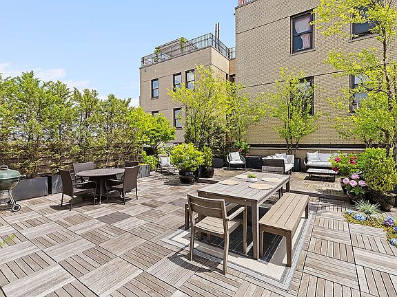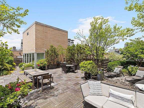 This unique, sun-drenched, triplex penthouse home has 4 bedrooms, 4 full bathrooms and was originally designed for the developer himself. It features floor to ceiling windows, 3 exposures, 2 south facing 35’ terraces, and a beautifully landscaped 1250 square foot roof deck with open city views; you can even see the river and Empire State Building!