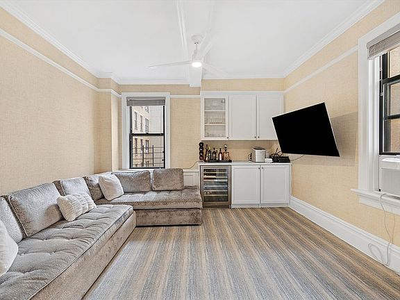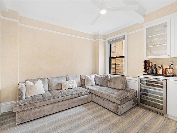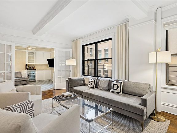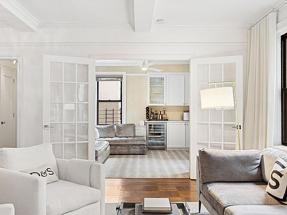 Apartment 7EF in The Florence, a distinguished co-op located at 545 West End Avenue between 86th and 87th Streets, is an expansive 7th floor combination unit offering classic pre-war charm and generous proportions throughout. The oversized living and dining areas are the heart of the home, featuring rich hardwood floors, beautiful ceiling beams, and enough space to comfortably accommodate a large seating area as well as an extra-large dining table. French doors open from the living space into a versatile den, complete with a built-in wet bar. There is a full-sized guest-accessible bathroom adjacent to the den and a coat closet off the entryway, as well as an additional large closet that provides practical storage without interrupting the home's flow.