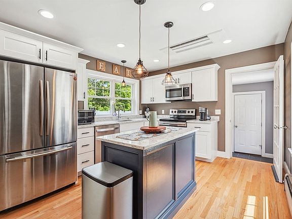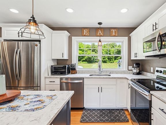 Welcome home to this expanded and updated cape on nearly an acre of land! Step into the updated kitchen with stainless steel appliances, quartz counters, and a center island which flows seamlessly into the living/dining room area. The first floor features a master suite with a walk-in closet and full marble bath. Upstairs, discover two additional spacious rooms perfect for bedrooms or offices. The recently updated basement is perfect for entertaining with surround sound, a dry bar, and a live-edge bar top with stools. Don't forget about the mudroom with tiled floors and a built-in bench which will lead you into the 2 car garage garage with plenty of storage space. Enjoy summer days in your expansive, private backyard with a new fire pit and oversized shed. Updates include mini splits, a redesigned front walkway, landscaping, and a new oil tank just to name a few. Don't miss the chance to visit our open houses and witness the beauty of this home for yourself!