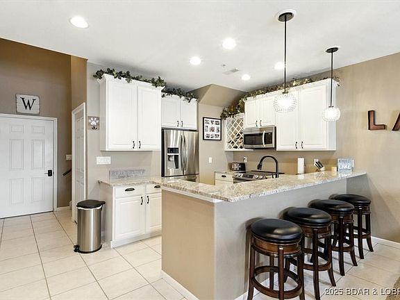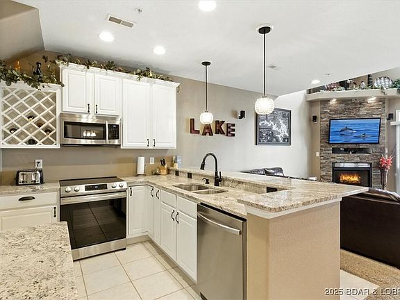 TOP FLOOR UNIT in the highly sought-after Stoneledge Condominiums located at the 20 mile marker in Osage Beach. This 3 bedroom 2.5 bath condo with a loft is ready for you to move into. The 3rd bedroom and half bath are located in the loft. This beautifully updated kitchen has gorgeous granite countertops, black faucets, pendant lights and new Stainless Steel Appliances. The Stove even has wifi so you can warm it up before you get back from boating! The living room has a vaulted ceiling, stone fireplace with electric insert, accent lights and surround sound. Bathrooms have updated granite countertops, lighting and faucets. There is a full size front load stacked washer/dryer in the unit and the HVAC system is newer with a wifi thermostat. Enjoy this one of a kind main channel view from the tiled and screened in deck. This condo is in the heart of Osage Beach and close to all the great dining and entertainment the lake has to offer. You won’t find a better condo at this price point which includes a hard to get 16x48 slip that will accommodate your boat now and in the future. The unit is fully furnished (less some personal items/decor).
