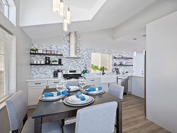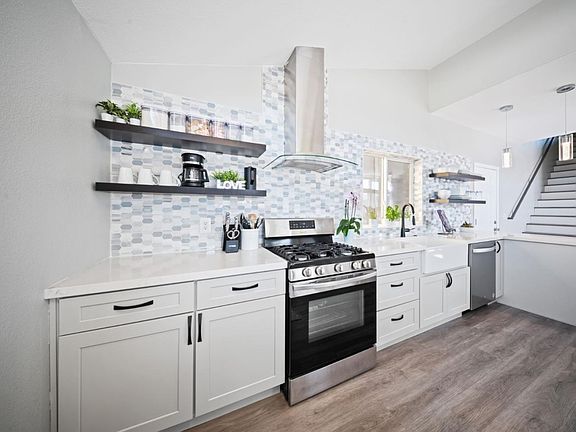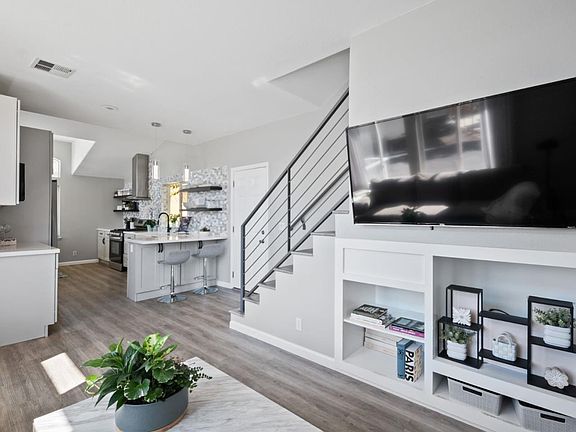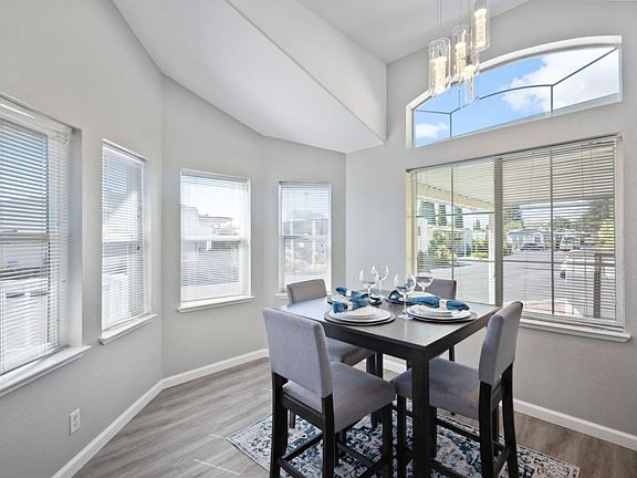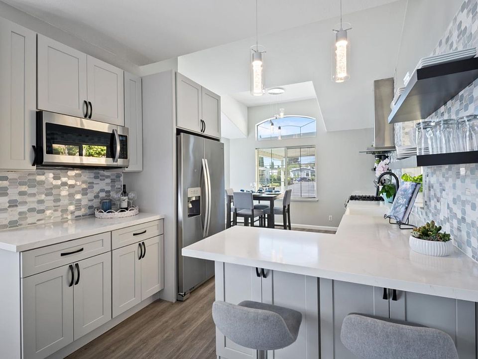 A rare two-story, three-bedroom, two-bathroom home in an all ages, pet friendly community. The bright living area is filled with abundant natural light and features insulated laminated flooring, updated lighting, and a custom stair railing. The fully remodeled kitchen offers quartz countertops with gold accents, a stylish backsplash, ZLINE hood, and Italian fireclay farmhouse sink. Bathrooms have been thoughtfully upgraded with skirted toilets, modern vanities, and shower heads with water filters. A full bedroom and bath on the main level provide flexibility for guests or multi-generational living, while the upstairs bedrooms, including the primary suite with sunset views, offer privacy and comfort. Additional highlights include side-by-side covered parking, a rare upgrade, as well as a brand-new electrical system, insta-hot tankless water heater, and shower filtration system. The community offers resort-style amenities such as a clubhouse, pool, cabana with kitchen for entertaining, and nightly security. This prime location provides easy access to Highways 101, 85, shopping centers, dining, and family-friendly recreation. Nearby, The Plex offers indoor sports, martial arts, a spa, and dining, while Coyote Creek Trail is perfect for cycling, running, and walking.