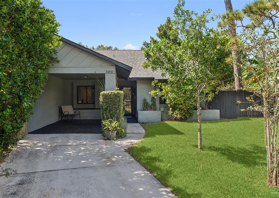 Welcome Home to 5450 Serene Lane! A well-maintained 3-bedroom, 2-bath duplex offering comfort, privacy, and a convenient location near Orlando. This home features tile flooring throughout, a split-bedroom floor plan, and an indoor laundry room. The kitchen is beautifully appointed with a black granite sink, tiled backsplash, and butcher block wood countertops. Bedroom 2 includes a barn door entry and wet bar, providing a unique and versatile space. Enjoy the outdoors in the screened and covered lanai or relax in the fenced backyard with additional patio seating. There’s also extra storage in the rear and a 1-car carport for convenience. The property backs to city-owned green space with no rear neighbors and a peaceful setting. Located in a quiet community with no HOA, this home offers both tranquility and accessibility—just a short drive to Orlando, shopping, dining, and major highways. Ideal for homeowners or investors seeking a low-maintenance property in a desirable Central Florida location.
