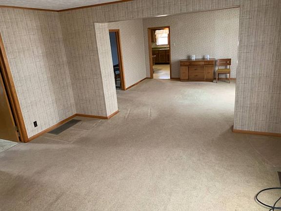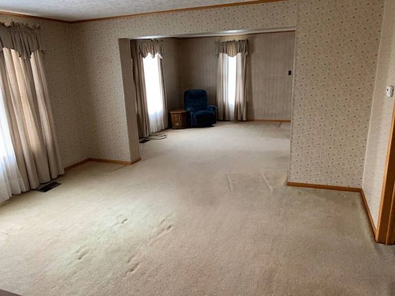 Entrance: Covered front porch opens to living room. Living Room: Large open room, cream plush carpet, neutral wallpaper Dining Room: Open to living room, continuous decor, these rooms are big! Kitchen: Lots of cabinets with ceramic backsplash. Stove and refrigerator included, vinyl floor, eat in kitchen. Office or Bedroom: Low nap carpet, paneled walls Bedroom: Cream plush carpet, painted walls Bedroom: Paneled walls, cream plus carpet Bath: Vinyl floor, cream fixtures, tub shower combo and vanity Basement is a partial basement which holds the GFA/CAC and water heater Exterior: 2 1/2 car detached garage, machine shed with two sliding doors and one walk through door. Small metal shed, small wooden chicken shed Some pasture, smoe wooded area, great for 4-H livestock and your garden. Close to both Rushville and Beardstown yet very private setting. Seller will furnish survey.