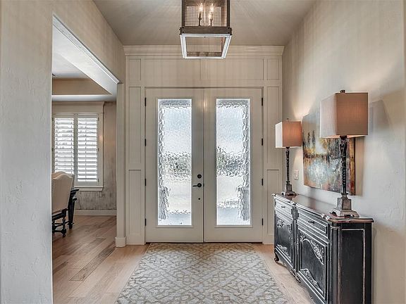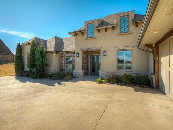 New in Norman. Nestled on a 1.2 acre lot in the prestigious gated community of Manor Lake Hills you'll find this gorgeous 4 bedroom, 3.1 bathroom, 3-car garage home is the perfect blend of comfort and sophisticated elegance. Through the front door you are welcomed with an open concept main living area featuring soaring ceilings, an abundance of natural light and wood flooring. The appointed study sits to the left of the front entry, elegant formal dining room to the right and is open to the main living area boasting cathedral ceiling with wood beams, a stone fireplace harnessed by custom shelving and built-ins. The kitchen is a chef's dream with butcher block island for additional seating, granite countertops, ample cabinet storage, gas range, 2 ovens, refrigerator and dining space. The secluded primary retreat is spacious with beamed tray ceiling and spa like bathroom offers separate vanities, walk-in shower and soaking tub. The expansive primary closet has numerous hanging rods, shelving, built-in cabinets, drawers, full length mirror and flows into the laundry room with utility sink and storage. Thoughtfully located opposite of the Primary suite are the secondary bedrooms and shared bathroom with tub/shower combo bolstered by separate vanity spaces. Upstairs you will find a wet bar with sink and microwave, secondary bedroom, bathroom, and bonus or game room. Safe room is located in downstairs secondary bedroom. The oversized 3-car garage has clearance to accommodate larger vehicles. The large back patio with fireplace is the perfect space for entertaining or relaxing in the evening. With serene views of the pond, proximate to the neighborhood pool and clubhouse, this beautiful home offers all the convenience of modern living and a peaceful retreat from city life.