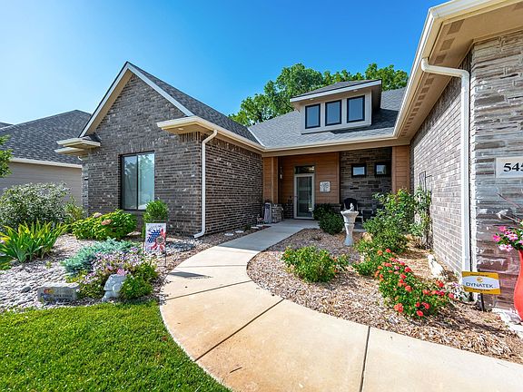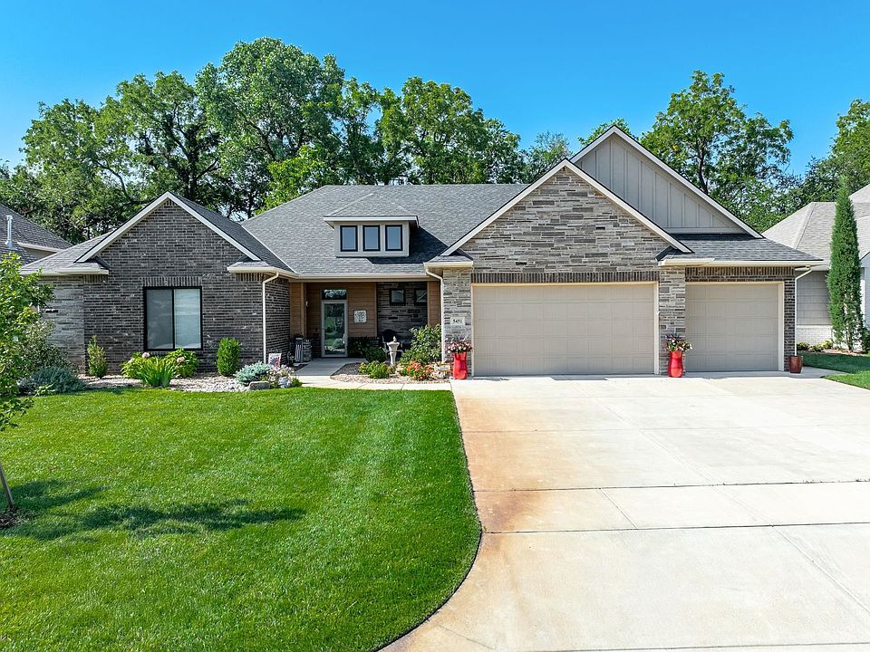 Welcome to your dream home! Step into this beautifully designed home featuring a bright foyer with 10' ceilings and an open layout that seamlessly connects the great room, dining and kitchen areas to a spacious all-seasoned room with fireplace and views of patio, pergola and landscaped back yard. The great room showcases 11' beamed ceilings, custom built-ins, and a striking stone accent wall. The gourmet kitchen includes a large quartz island, gas cooktop, walk-in pantry with barn door, and a dedicated coffee/wine bar. The luxurious primary suite offers crown molding, a custom tile shower, dbl. vanities, and a makeup area. The second bedroom is a private en-suite ideal for guests. Additional highlights include a large laundry room with custom cabinetry including a drawer featuring fold out ironing board, 3+ car garage-perfect for extra storage, hobbies or workshop. This former model home is located in the desirable Suncrest community in Northwest Wichita. The HOA fees cover lawn care, snow removal, trash, and access to top-tier amenities including a clubhouse, boating lake, sandy beach, two swimming pools, pickleball court and playground. Don't just imagine living here-call to schedule your private tour. Home to have new roof, gutters, downspouts due to hail storm on 9-3-25