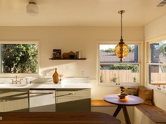 Tucked into a coveted pocket of Eagle Rock, this thoughtfully reimagined 1950s California compound blends timeless design with modern updates. The main house offers 3 bedrooms and 2 bathrooms, while the converted garage provides a flexible 1 bed/1 bath guest house; ideal as a studio, workspace, or in-law suite. Natural light floods the expansive living room through a large bay window, with a stately decorative fireplace grounding the space. Restored wood floors and original windows preserve the home's mid-century character and craftsmanship. The formal dining room flows into a beautifully renovated kitchen, perfect for hosting holidays or everyday meals. Marble countertops with coved edges, custom cabinetry, and a sunny breakfast banquette create a warm, functional centerpiece for the home. The den and main bedroom wing feature a rich, dramatic palette, adding depth and sophistication. The primary suite includes a walk-in closet, jewel-toned shower, and direct access to the backyard. Two spacious guest bedrooms and a stylish shared bath complete the main residence. Outside, enjoy a private backyard retreat with mature landscaping, a sparkling pool, and plenty of space for dining, relaxing, and entertaining. Located north of Colorado Blvd near Dahlia Heights Elementary, you're just blocks from Eagle Rock's favorite shops, cafes, and hiking trails.