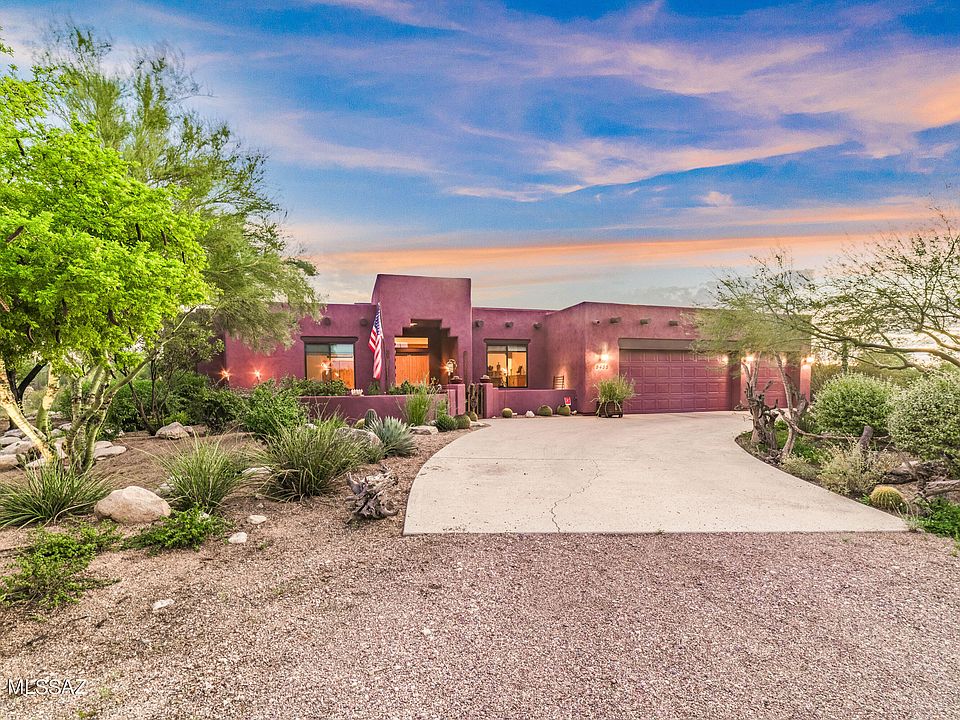 Your Oasis awaits on Oasis Road! Beautiful SW home with 3 car garage on 3.31 of pristine desert acres w/stunning panoramic Tucson, Tortolita & Catalina Mtn views! Enter the home through the oversized alder double doors into the welcoming foyer. The great room has handsome wood flooring and neutral tones. Spacious kitchen offers plenty of alder cabinets & counter space, huge center island & bar seating near the cozy stacked stone fireplace. The gourmet kitchen features SS appliances: double oven, microwave, gas cooktop, and dishwasher. Hard wood flooring along with tile throughout the home. Primary suite is a cozy retreat with a huge walk-in closet with alder built in cabinetry. The en-suite bathroom features a double vanity, jet soaking tub, and separate shower. Exterior living is an entertainer's delight featuring a water fountain, covered patio, firepit, w/amazing panoramic views and four separate back yard areas. The enchanting yard has lush greenery throughout. Make this your dream home! Schedule a private showing today!