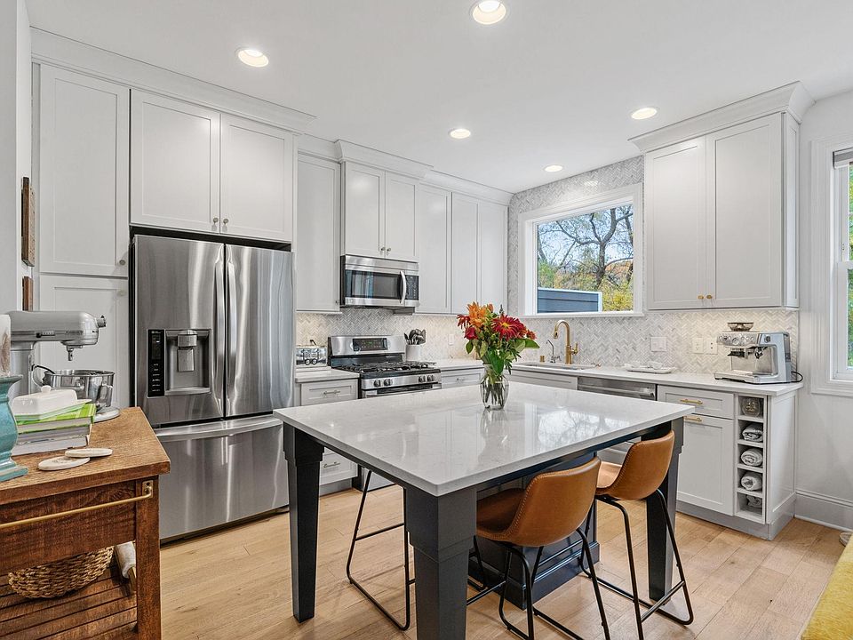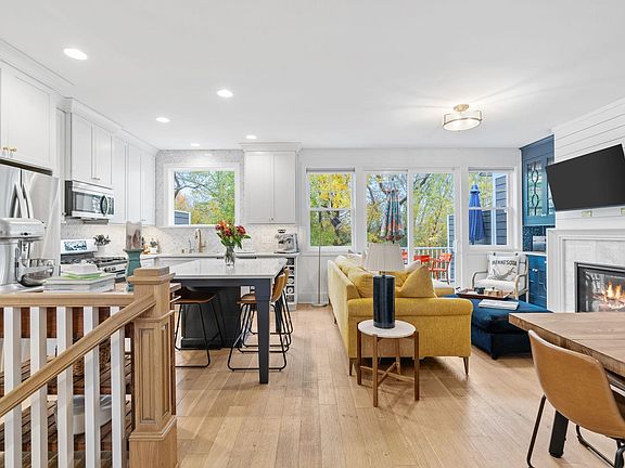 Wide-plank white oak hardwood floors bring warmth to the open main level, where natural light fills the living room and frames views of the surrounding trees. The gas fireplace, accompanied by a custom wood mantel, anchors the space, and the adjoining deck provides a quiet retreat overlooking the green space. The kitchen features full-height white shaker cabinets, Cambria countertops, a center island with seating, and stainless steel appliances, creating a polished and functional hub for everyday living or weekend entertaining.