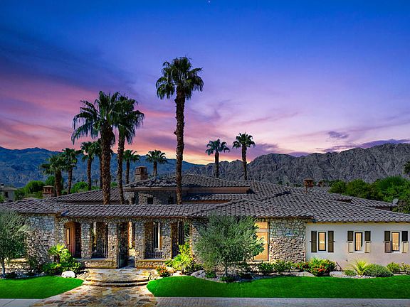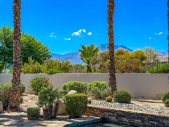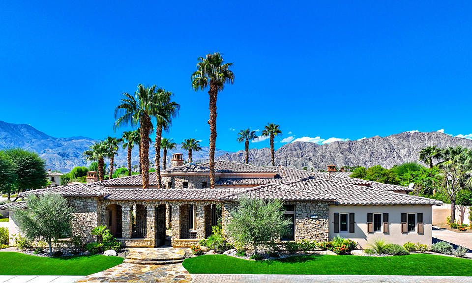 Griffin Ranch, and the Sevilla floor plan was part of the Merv Griffin dream, stately homes, with character, amazing curb appeal, large home sites, mountain views with dynamic sunsets. When touring this previous model home you'll notice the quality throughout, from wood baseboards & doors to the solid wood beams, double Kitchen Islands & complete wolf appliance package, nothing fake here, this is the real deal. Enter the spacious living room, you're eyes will be drawn to the one of kind fireplace with full brick wainscoting. Stroll through the 10' custom stackable doors to the fresh water pool , spa & waterfall designed by one of the leading builders in the Coachella Valley. Moving back indoors, pass by the sunken bar with under counter refrigerator to the inviting morning room, amazing cooks kitchen with space for all to participate and a family size dining room where no one will be left out. This space is so well designed, gathering together is great, and finding space for yourself just as important. The southwest facing views of the Santa Rosa Mountain are magical whether enjoying morning coffee or a chilled glass of wine at night. This is a corner lot so the privacy is special and the location near the clubhouse is super desirable. Griffin Ranch clubhouse & sports amenities are worth bragging about with eight pickleball courts, two tennis courts, a palates room with four reformers, separate fitness area, Jr Olympic size pool with dedicated swim lanes, hot tub, cabana's, 9 hole putting green, two bocce courts, event space & wow does Griffin Ranch HOA through several amazing parties throughout the season. If you are looking for ''Grand'' you found it, This home is being offered furnished, so bring your suitcase and get ready for a marvelous 2025/2026 Season at Griffin Ranch.
