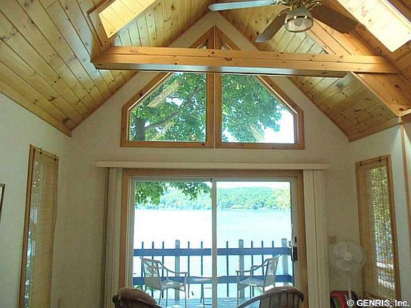 Totally Turn Key, Year Round Conesus Lakefront Home! Move right in for the summer! Completely furnished (minus just a few items), with dock & Boat Lift! Just bring your suits & a boat! Beautiful architectural features Incl Pine Cathedral Ceilings, Skylights & Large Lakeside Windows. Also includes a Grand Master Bedroom with its own Balcony, Lakeside Deck, Fireplace, Central Air, 2, possible 3 Bedrooms, 2 Full Baths & 1585 sq ft. This home was rebuilt in the '90's including a New Second Floor. Low Maintenance to give you plenty of time to fish, go boating, water skiing & Just Relax!!!