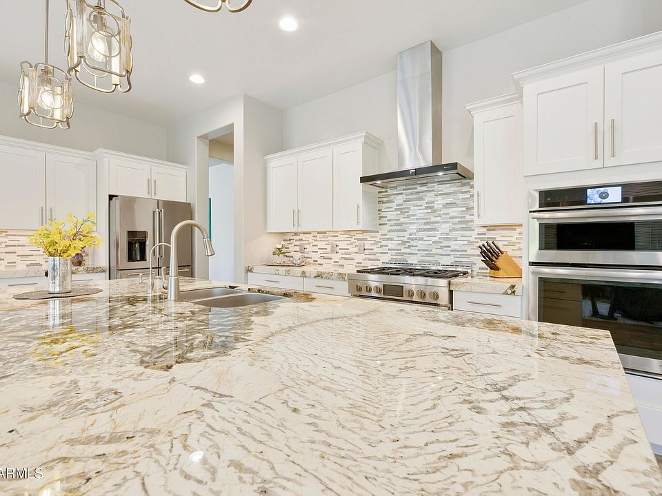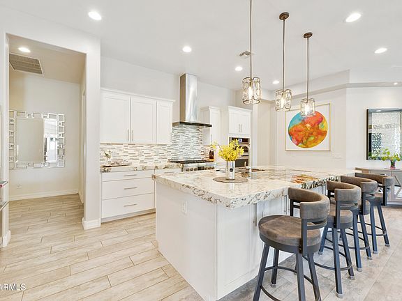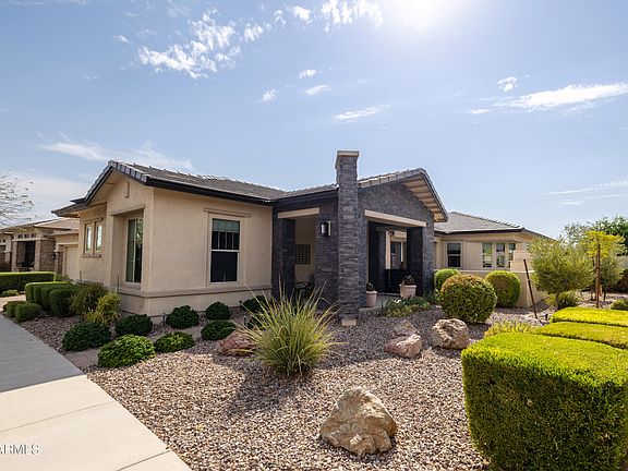 This highly sought after concert floor plan offers an abundance of thoughtful features & comfortable living space. The flexible floor plan includes 2 well-appointed en-suites, each with a W-I closet & private bthm with dual sinks, framed mirrors, & W-I shower. The gourmet kitchen boasts Jenn-Air appliances (3 ovens & gas range), an oversized center island with cabinetry on both sides, & upgraded granite countertops. The wet bar in the flex/dining rm provides an ideal space for entertaining & access through the multi-slider to the gated courtyard with B-I fireplace creates additional entertainment space. The great rm features a stunning stone wall with electric fireplace. The second multi-slider is off the great room & leads to the professionally landscaped yard with extended covered... ...patio & mechanical awning, & B-I BBQ creating an ideal indoor-outdoor living space. The home boarders a walking path & common area, offering a private tranquil setting. Additional features include oversized laundry rm with ample cabinet storage & a utility sink. There is also a den/sitting rm off the primary bdrm, a lg W-I pantry, & custom shutters in most rooms. The open-concept floor plan with wood-look tile T/O creates a cohesive & welcoming atmosphere. In addition, the home offers an extended 2-car garage with overhead storage, a water softener, tankless water heater & 22 seer air conditioners. You will also love the lifestyle at Encore at Eastmark, offering many activities & clubs. Are you looking for pickle ball, tennis, bocci ball, craft rm with 2 kilns, billiard rm, meeting rms, library, Proving Ground Café & many places to make new friends? Then Encore maybe for you!!!