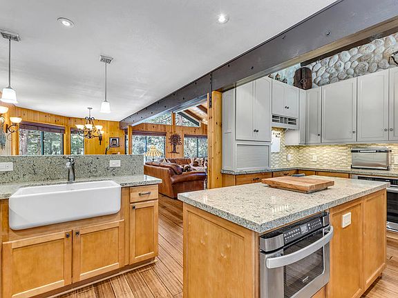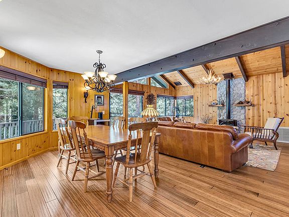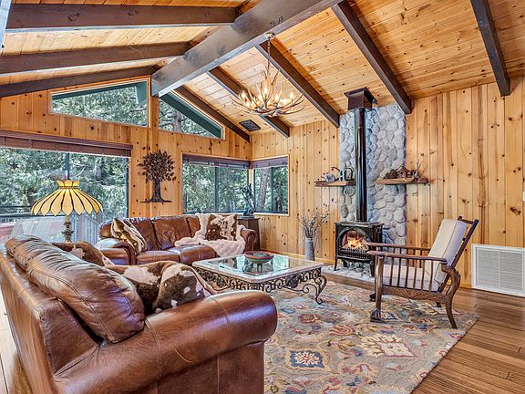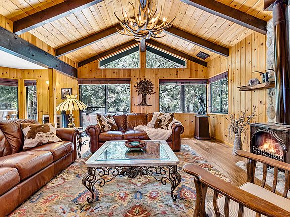 This exceptional property offers a rare combination of single-story living and nearly an acre of level land, providing a sense of tranquility while being close to town. This property is a nature lover's dream, featuring meandering trails, conversation areas, fruit trees, landscaped yard with a seasonal creek. Upon entering the home, the knotty-pine walls and bamboo flooring create a warm ambiance. The open concept living space has vaulted ceilings with exposed beams, offering a blend of spaciousness and character. The kitchen and bathrooms have been beautifully upgraded, along with dual-paned windows and sliding glass doors with between-the-glass blinds, adding a touch of contemporary elegance while maintaining the mountain feel. The family room features a free-standing propane stove with floor-to-ceiling stonework, adding charm and practicality. The primary bedroom boasts a spa-like en-suite bathroom providing a peaceful retreat. 2 guest bedrooms with deck access offer stunning forest views, and a flex room, currently used as an exercise room with a laundry closet, provides versatility for various lifestyle needs. Enjoy an art studio and a media room, each with their own entrance, adding unique spaces for creativity and relaxation. Recent upgrades, exterior paint, extensive stonework and a sprinkler system. With modern conveniences seamlessly integrated into the mountain feel of the home, this property epitomizes the best of both worlds.