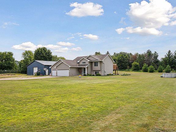 A 6 bedroom house + a 3 stall insulated heated garage + a 60X40 pole building? YES PLEASE! Welcome to this great split-entry home built in 2004 and situated on a generous 2.72-acre lot. This home boasts an open-concept design on the upper level. The spacious kitchen features newer stainless steel appliances and granite countertops and is open to the dining and living room areas. The upper level also includes a large primary bedroom with a walkthrough full bathroom featuring granite countertops and a second bedroom. Downstairs you will find four additional bedrooms and a 3/4 bathroom, offering ample space for family and guests. Step outside from the dining room onto a low-maintenance deck with a lovely patio at the bottom of the stairs, providing expansive outdoor space for gatherings and relaxation. A standout feature of this property is the recently added 60X40 pole building with 12 foot side walls, 10 foot doors, full concrete floor with 6" of concrete, electricity, some animal enclosures and some lights. This versatile space offers endless possibilities for use, from a workshop to a storage area, making it an exciting addition to the property. Don't miss the chance to own this fantastic property with plenty of space, inside and out!