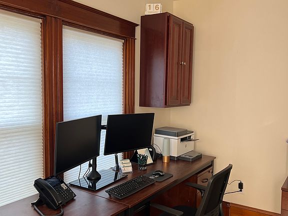 This is a one-of-a-kind property offers both residential and commercial space. First floor offers an ADA bathroom, two offices, reception area and heated front porch. Second floor offers full bathroom, bedroom, living room and kitchen. Third floor is storage. Two car garage parking. Washer and dryer in basement. Rental includes all utilities, internet, trash pickup, lawn care and snow removal.