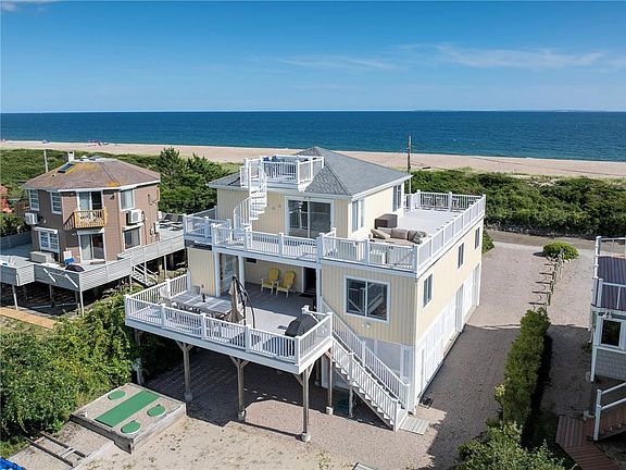 Your quintessential beach getaway. The waterfront property offering breathtaking 360-degree views of East Beach, Block Island Sound, and Ninigret Pond comes fully furnished. The waterfront property on Niniget Pond features a private walkway to the Pond with its own mooring. Just a few steps across the street to 3.5 miles of pristine sandy barrier East beach. Crystal clear blue waters of the Atlantic Ocean. The open layout is ideal for entertaining inside & outside, the beautifully furnished second-floor living room is perfect spot to enjoy the expansive ocean views. A Bose sound system with four zones enhances the ambiance throughout the home. Significant updates have been made including expansions to the dining room, den, office, exterior bathroom, and additional deck space, now totaling over 1,000 square feet. The roof deck offers panoramic views of the ocean, pond. An additional full outside bathroom on the first level deck for showering off. Perfect after a long day at the beach before you head inside the house. A 2,500-gallon cistern for water supply, and a denitrification septic system. A one-car garage and ample parking for about 8 more cars. For those seeking the pinnacle of coastal living a perfect blend of luxury & relaxed beach living.