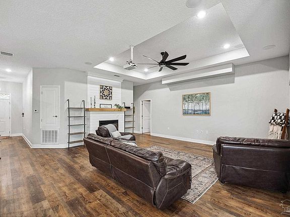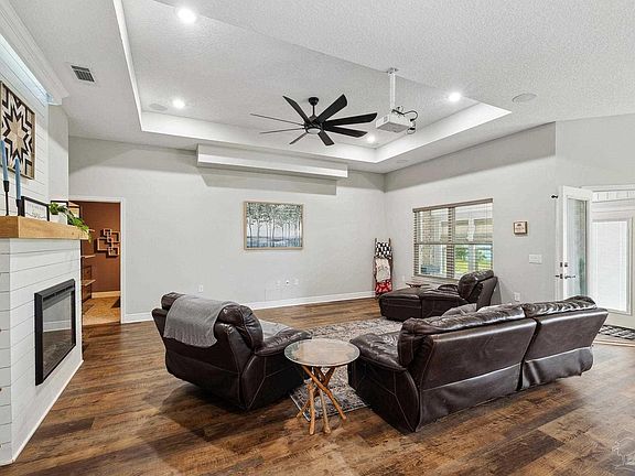 Nestled right between the open countryside, this contemporary style home sits on over 1 acre of land that is fully cleared for you to enjoy all the best amenities of country living. Built in 2019, this 4 bedroom, 2 bath open concept home features a timeless feel with all the modern amenities. Entering from the large two car garage, the open floor plan leads you past the laundry room with luxury vinyl plank flowing throughout the common areas. The living room features raised tray ceilings, an electronic fireplace and mantle, and a built-in projection screen/audio system for optimized video viewing. The kitchen, which overlooks the living room and breakfast nook, features granite countertops, a large island, stainless steel appliances, and a large pantry. The split master bedroom off the kitchen features an en suite bathroom with a large floor to ceiling tiled glass shower, spacious garden tub, and double vanity. The remaining three bedrooms are on the other side of the property and all feature large closets and carpet. All bedrooms share a spacious common bath off the living room. Off the living room is a large bonus sunroom lined with windows facing the backyard. The bonus space is heated and cooled and offers additional storage and sitting space. Out the back door, you step into an oasis with all the amenities to keep you occupied for hours. The backyard which is fully enclosed by a privacy fence features a saltwater inground pool and a separate pool house. There is a full exterior kitchen with another full bathroom outside featuring a glass shower. There is an additional building and carport out back for all your storage needs which features an oversized garage door. Come see the best that country living, and modern sophistication has to offer.