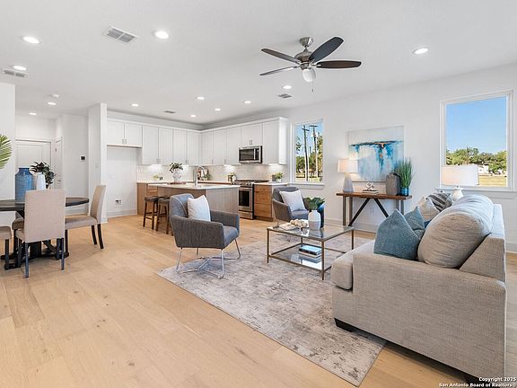 Welcome to Victoria Commons, located in the culturally rich and vibrant Lavaca Neighborhood part of Southtown. Steps from everything Downtown San Antonio has to offer, including award-winning restaurants, cocktail lounges, coffee shops, vibrant arts scene, theater and music venues, Alamodome, Hemisphere-Civic Park, Riverwalk, Blue Star Arts Complex, Museum and Mission Reach, and ease of access to major expressways. Don't miss out on the chance to experience the best of city living in this truly exceptional home. Experience the ALAMO floor plan, a seamless blend of contemporary design and everyday comfort. The entry level features an open-concept main floor centers on a bright living area that flows into the dining and kitchen. The spacious kitchen features quartz countertops, a generous island, tasteful backsplash, sleek appliances, gas cooking, custom cabinetry, and a pantry. On the second level the primary suite offers a tranquil retreat with a balcony, dual-vanity bath, walk-in shower, and a generously sized closet, study or gym, utility room, secondary bedroom and full bath. A versatile third level hosts a spacious game room with large balcony, plus a third bedroom and full bath. Thoughtful design, abundant upgrades, and energy-efficient, low-maintenance features make everyday living effortless. Listing images are for representation purposes only and vary for all floor plans.