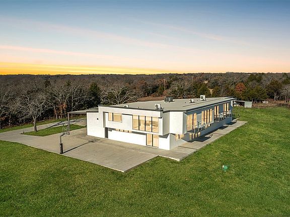 Immerse yourself in this extraordinary contemporary estate, gracefully set on 5 acres. The open-concept design features a grand living area, highlighted by soaring 20-foot windows that flood the space with natural light, creating a sense of airy expansiveness. The dining area seamlessly transitions into an elegant bar, equipped with a jumbo screen and abundant storage beneath sleek quartz countertops. The chef’s kitchen is nothing short of spectacular, boasting top-tier appliances, including dual