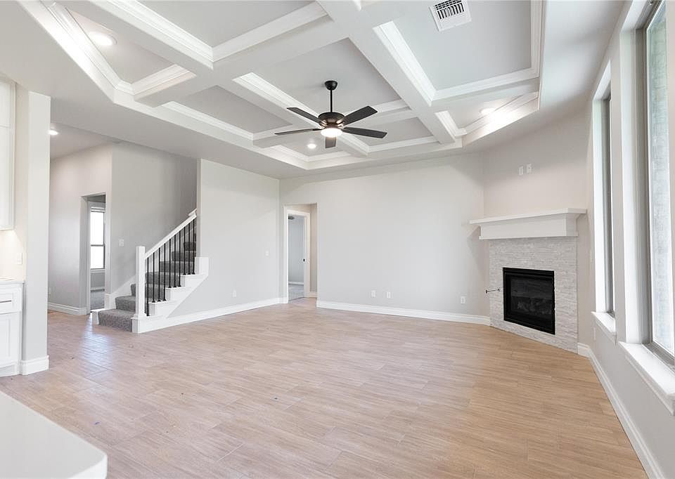 This Hazel Bonus Room 5 Bedroom has 2,735 Sqft of total living space, which includes 2,520 Sqft of indoor living space and 215 Sqft of outdoor living space. This two-story luxury home offers 5 bedrooms, 3 full baths, 2 covered patios, a spacious bonus room, a large utility room, and a 3-car garage with an in-ground storm shelter installed. The living room presents a stacked stone corner gas fireplace, three 7’ windows, wood-look tile, Cat6 wiring, rocker switches throughout, and an impeccable coffered ceiling with a ceiling fan and crown molding. The kitchen supports stainless steel appliances, including a 5-burner cooktop and double ovens, custom-built cabinets to the ceiling with cabinet hardware and under cabinet lighting, upgraded 3 CM countertops, stunning pendant lighting, a large corner pantry, modern tile backsplash, and an oversized island with a built-in trash can pullout. The primary suite offers a sloped ceiling with a ceiling fan, windows, and our cozy carpet finish. The prime bath features a dual sink vanity with framed mirrors, a free-standing tub, a walk-in shower, a private water closet, and a HUGE walk-in closet. Covered outdoor living boasts a wood-burning fireplace, a gas line for your grill, and a TV hookup for your flatscreen. This home also offers our healthy home technology, a tankless water heater, a whole home air filtration system, R-44 insulation, and more!
