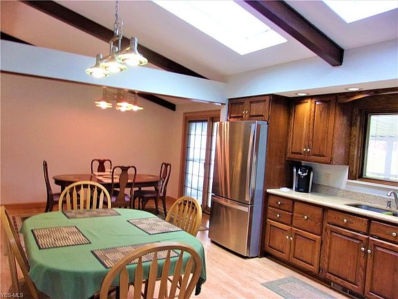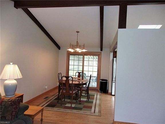 Beautifully updated 4 bedroom/2 full bath split level in desirable Sagamore Hills! Sharp, neutral décor, open beamed ceilings throughout living room, dining room and kitchen affording a sleek contemporary look! Eat-in kitchen w/stainless appliances features 2 newly installed skylights, ambiance canned lighting, open to dining area that leads to covered patio enclosure with new windows and screens. Fresh neutral paint and carpet throughout allows a clean slate for your personal décor preferences. The step-down family room boasts a wood-burning fireplace with built-ins and door to outside. Convenient laundry room with commode, vented glass block window, new laundry tub, washer and dryer are included. So many costly updates include new roof and gutters w/leaf guard (9 mos.) Furnace (5yrs.) A/C (3 yrs.) HWT (4 yrs.) updated electrical box and service, new insulated garage door and opener (18 mos.) Vinyl siding, extra attic insulation, and double pane windows throughout, Pella sliding doors w/built-in blinds and matching, large bay window in LR and kitchen. ** BONUS** 2.5 car back garage w/newer roof, gutters, leaf guard, and siding matching house, separate concrete driveway, electricity/heat, great for car enthusiasts and teen extra parking!! Fenced in area for child play and separate dog kennel. Situated on almost an acre, this lovely home is a great place for family and friends to gather, inside and out, at an affordable price!!! Gloves and booties provided for viewing safety!