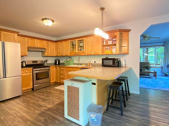 3 bedroom 2 bath home with full basement and 2 car attached garage. New flooring and baseboard throughout main level. High speed Spectrum internet. No HOA. Low back deck, perfect for grilling. Covered front porch. Large kitchen with sit in dining. Renovated bathroom with double vanity. Close to Golf, Lakes, and Ski Hills.