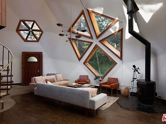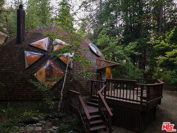 While experimental in nature at the time during their inception in the 1920s, Geodesic dome architecture would go on to become a beloved and rare style of home, creating an incredibly unique experience for those inhabiting within them. 54640 Lookout Road is just that, and seamlessly weaves itself into the surrounding lush Idyllwild mountainous backdrop. In this 1986 built spherical structure, a creative use of multi-shaped skylights bring a wave of natural light into the main spaces, and a scenic view of the sunsets in the evenings and stars at night. Quiet and secluded, the property offers a unique mountain experience mixed with modern amenities, original warm panelling and stylish, sharp design. A recently revamped kitchen features polished concrete counter tops and stainless steel appliances. Additional newer upgrades include cork flooring, a new hot tub, new water heater, new washer / dryer and new guest house roof. Walkable to Downtown and hiking trails. An ideal vacation home or primary residence in one of the most desirable locations in Idyllwild.