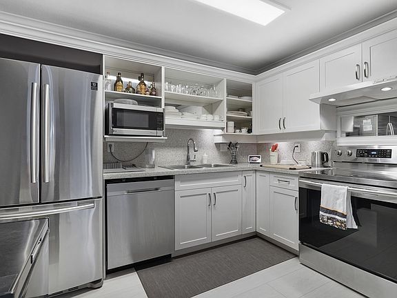 Kitchen with quartz countertopsStainless steel appliancesBalcony with courtyard views