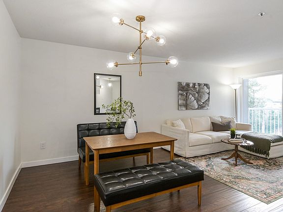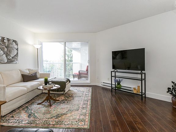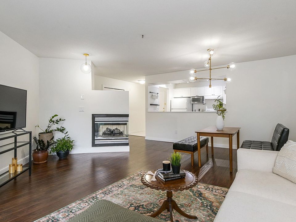 Updated lightingWarm laminate floorsWhite kitchen cabinetsStunning three-sided gas fireplaceWell-maintained rain-screened building