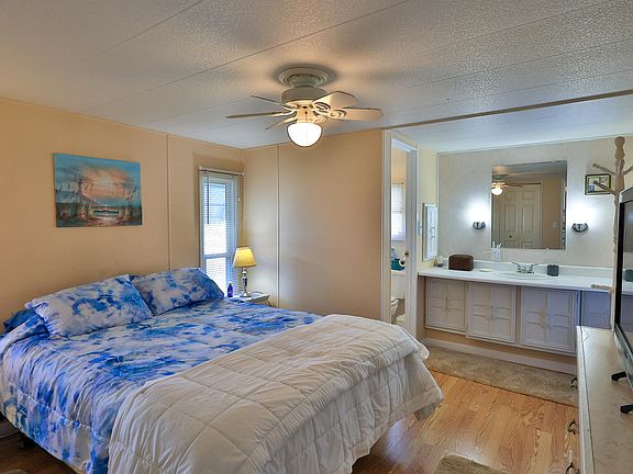 Adorable well maintained fully furnished and move in ready mobile home with grassy yard! No HOA or lot fees. Approximately 10 minute drive to the beach. This home features split bedrooms, a Florida room and beautiful vinyl plank flooring throughout over a replaced subfloor 0f 3/4 inch tonge and groove plywood. A/C was replaced in 2019 and roof in 2017. Property also includes a newer roomy storage building. Make this your primary home, a second home or an investment property (one month minimum rental)!
