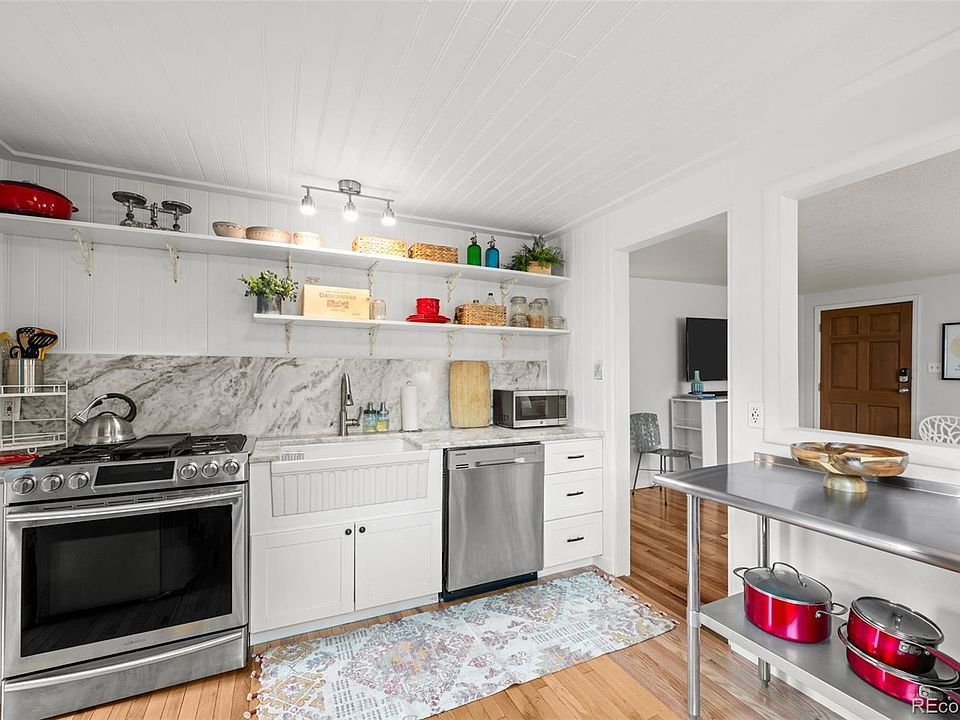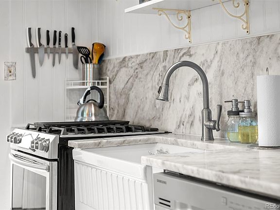 Ideal location within walking distance to Old Town Arvada and the lightrail. Thoughtfully designed floorplan on this 2 bedroom beautifully landscaped and updated cottage near Old Town. Hardwood flooring throughout, beautiful french bistro style kitchen with stainless appliances that include a gas range, white marble countertops, floating shelving and incredible natural light. The full bathroom offers well designed space with marble mosaic flooring, wood accent wall panels, marble countertop and floating shelving. Each bedroom has a walk-in closet and hardwood flooring as well. The home is filled with natural light from the many windows throughout. The large mudroom/laundry area just off the kitchen offers additional storage and quick access to the fully fenced back yard. The gorgeous yard is filled with well maintained mature trees, and flowering shrubs. There is a sprinkler system for both front and back, and the a newer back patio is perfect for summer evenings. The dog run is just off the oversized garage. The home is completely move in ready with everything you could ask with upgrades like central air conditioning, tankless water heater, newer double pane windows, new electric panel and newer appliances. Truly a charming property in such a convenient location. Walk to restaurants, bars, shops, trails or jump on the light rail and be in downtown Denver in less than 20 minutes, easy access to I-70 also provides a short drive to the mountains. Enjoy all that West Metro Denver has to offer in this beautiful South Arvada location.