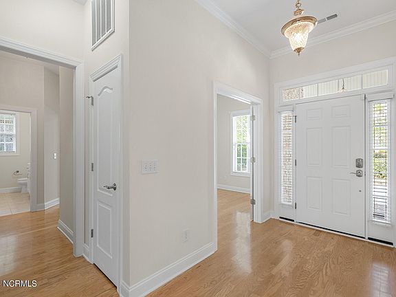 Elegance best defines this stunning home in the Reserve at Masonboro, one of the most sought-after communities in the Wilmington area. The home's curb appeal is superb, enhanced by the transitional style architecture, manicured landscape, and a canopy of mature trees. The impressive interior incorporates a semi-open floor plan accentuated by a soft color palette, extensive millwork, and hardwood flooring. The kitchen boasts generous countertops with complimenting backsplash, custom cabinetry, a gas cooktop, vented hood, pantry, and a cheerful breakfast area. For more formal occasions, the nearby dining room is embellished with classic detailing including crown molding, wainscoting, and an attractive chandelier. The spacious downstairs primary suite is a retreat of its own; it includes a large walk-in closet and is adjoined to its luxurious bathroom, comprised of a double vanity, soaking tub, and a separate shower. Two additional bedrooms - equally well-appointed and sharing the hall bathroom - are located downstairs. Upstairs, the bonus room over the garage (4th bedroom) is equipped with a full bathroom and can be utilized as a playroom or media room. One of the prominent features of this move-in ready home is the sunroom overlooking the private backyard. Other important features of this stately home include a gas fireplace, laundry room, patio, and a two-car garage. Residents of the Reserve at Masonboro enjoy amenities second-to-none including a clubhouse, pool, and community pier. This beautiful waterfront community offers a scenic marsh backdrop and is ideal for the kayaking enthusiast. Welcome home!