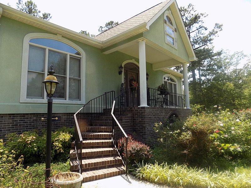 This well appointed country home offers privacy with pond views and more. Follow the cement drive from Middendorf Road and the lot opens up to adorning landscaping and shade casting trees. A grand entry awaits via steps on each side of the front porch.. perfect for a rocking chair to soak in the signing of birds and a glimpse of a neighboring pond. The foyer, grand on it's own, prepares you for this lovely home's numerous features, such as hardwood flooring, pitched and trey ceilings, wainscoting, extensive moldings, columns, hard surface tiling, and so much more. The wood burning fireplace in the living room is an alluring focal point with it's beautiful, ornate mantle. A beautiful chandelier complements the natural light that fills the room. A formal dining room awaits family and friends for entertaining and the equipped kitchen provides the tools and space to prepare the bounty. The kitchen, with new appliances, is not only functional, but very fashionable.. glass fronted cabinets, stainless appliances, hardwood flooring, beautiful lighting in the breakfast area, ample cabinetry and rich colors. The master suite's bath includes a beautiful claw foot tub, walk in shower, make up area, hard surface tiling, ornate moldings, and wall covering that accentuates the ceiling and natural light. With three bedrooms, two baths, the home is very cozy, accommodating yet with a hint of formal in a country setting. With fresh painting, laundry room, 2 stall carport, .60 of an acre lot, central heat/air and other features that have to be seen to appreciate.