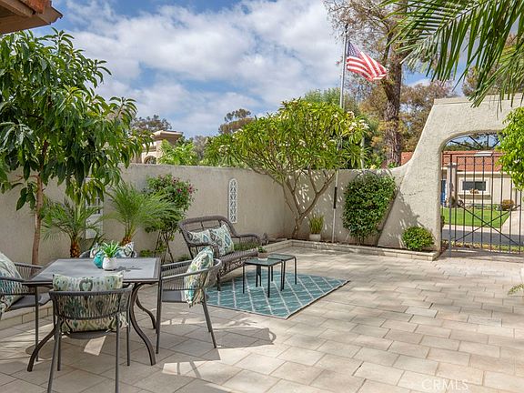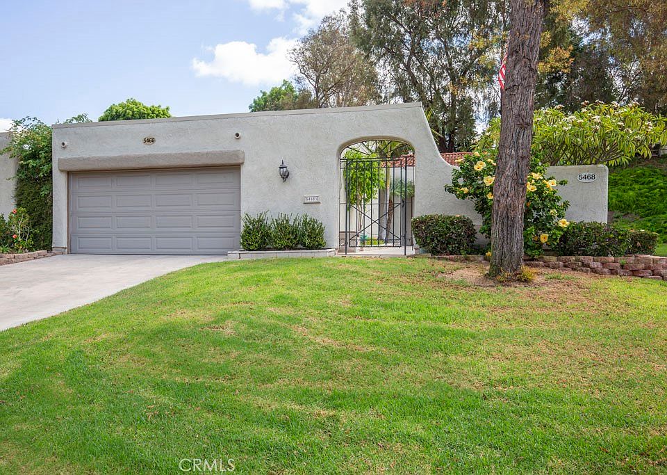 Welcome to 5468-C Paseo Del Lago – a beautiful upgraded single-level, end-unit, three-bedroom, two-bath CABRILLO residence in the active Laguna Woods senior community. Situated in a tranquil cul-de-sac far from busy roads and noisy highways, this home boasts excellent curb appeal. The large private front courtyard is paved with attractive stone tile and is the perfect setting for outdoor entertaining, dining or relaxing. This large courtyard extends around the garage to a covered side patio that separates the garage from the main house. The attractive front door with etched glass inserts opens to a spacious living room that has direct access to the large covered rear patio which looks onto an expansive grassy area. This is an excellent floorplan for a homeowner who enjoys outdoor entertaining. The kitchen boasts granite countertops, an attractive tile backsplash, stainless steel appliances, a window overlooking the front courtyard and seating for up to three at the breakfast bar. The kitchen island offers additional counter space and cabinet storage capacity. The primary bedroom suite also has direct access to the rear patio via a glass slider. The primary bedroom closet has been reconfigured to be a walk-in. The primary bathroom has a shower only while the guest bathroom features a tub/shower combo. Both showers have lovely stone walls and convenient accessory shelves. Either of the two guest bedrooms could serve as a workout room, arts and crafts studio or home office. One of these bedrooms has direct access to the side patio. Upgrades throughout include smooth ceilings, crown molding, recessed lighting, dual-pane windows and sliders, attractive wood flooring and central HVAC. The oversized detached garage has washer-dryer hookups, a convenient utility sink and easily holds two vehicles plus a golf cart. The driveway can accommodate up to four additional vehicles plus there is ample street parking for guests. Do not miss this spectacular home!